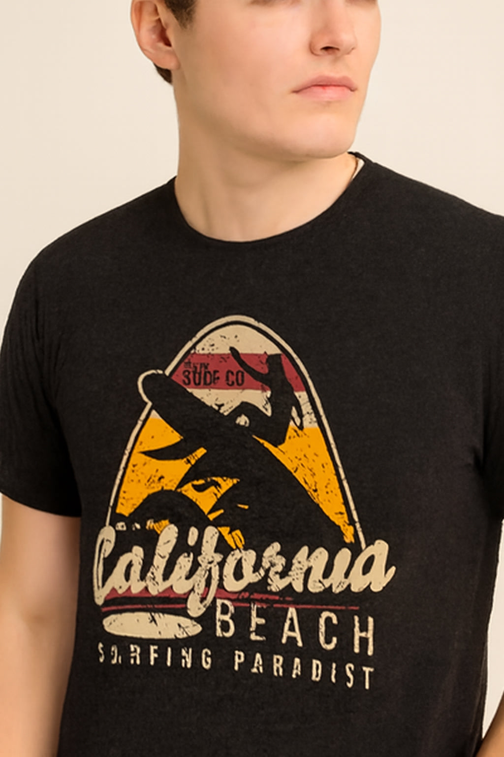 The charcoal Charcoal grey base is elevated with a bold and trendy California Beach Surfing Paradise graphic print in vintage tones, making it a must-have for men who love adventure and a cool, laid-back style. Its round neckline and half sleeves ensure a classic fit that never goes out of fashion.Made from soft, breathable hosiery cotton, this T-shirt ensures day-long ease, durability, and a perfect casual look.