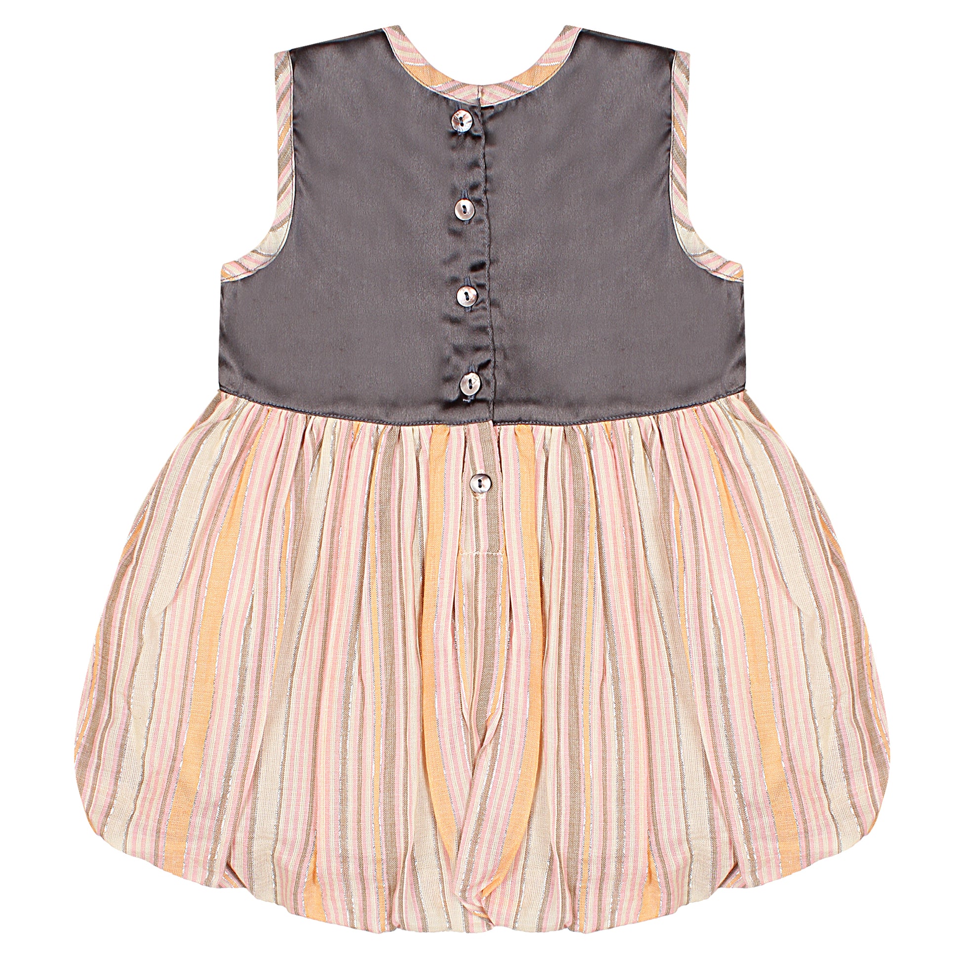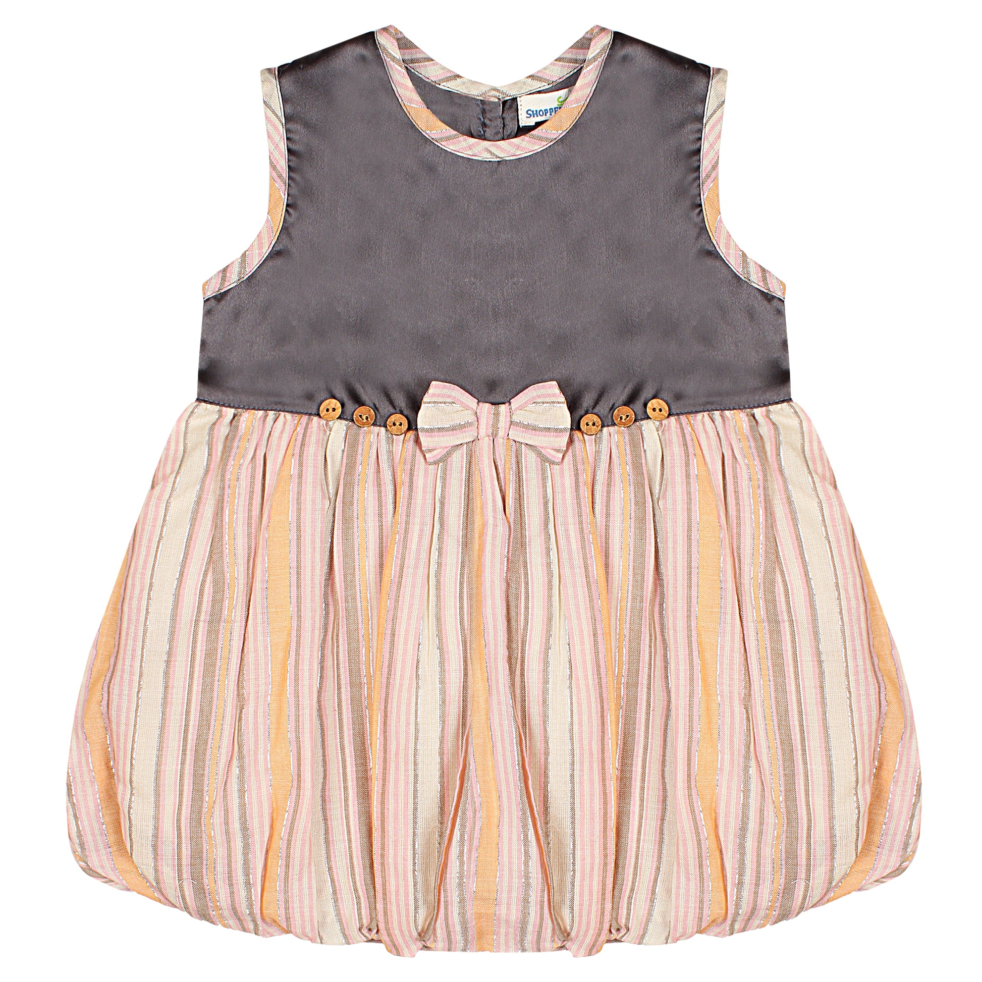 Add a touch of playful elegance to your child’s wardrobe with this SHOPPERTREE Cotton Blend Striped Dress. Made from a soft and breathable cotton blend, ensuring all-day comfort and ease of movement. Solid charcoal-grey satin-finish yoke for a refined, classy look. A cute bow at the waist enhances the charm of the dress. Stylish button detailing along the waistline adds a touch of handcrafted elegance. Gently gathered balloon-style hem offers a voluminous, playful silhouette.