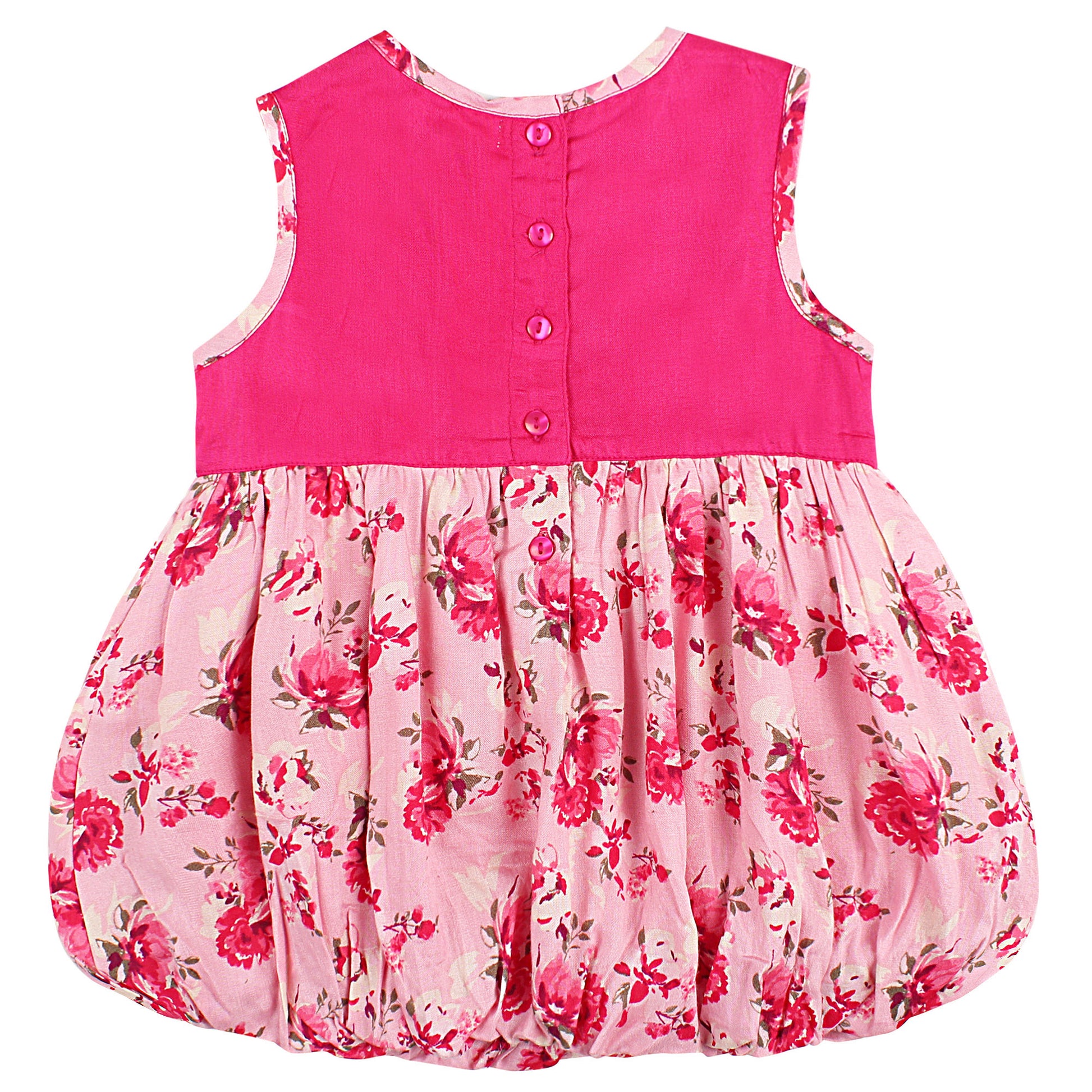 Floral printed balloon dress with dark pink upper portion has a special meaning for the summers. The matching lace put on it enhances the dress to a great extent. Easy to wear and maintain. Designed specially for summers.