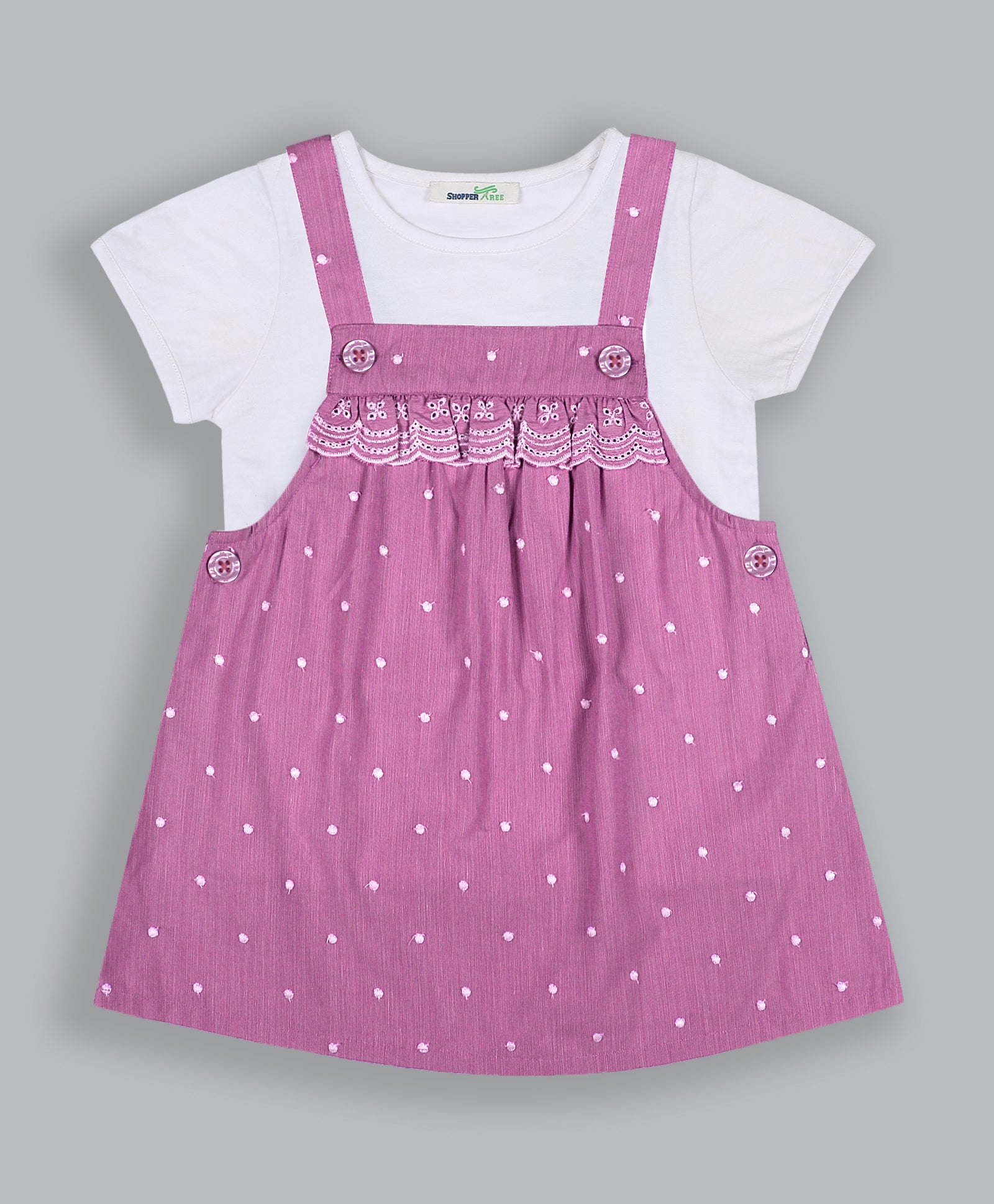 A Combo Consists Of A Pure Cotton Hosiery T-Shirt And A Dress Made Of Pink Is Meant For Summers. Can Be Worn Casually As Well As Formally. White Coloured Embroidery Looks Great On The Dress. Highly Sophisticated. Light Iron Will Work.