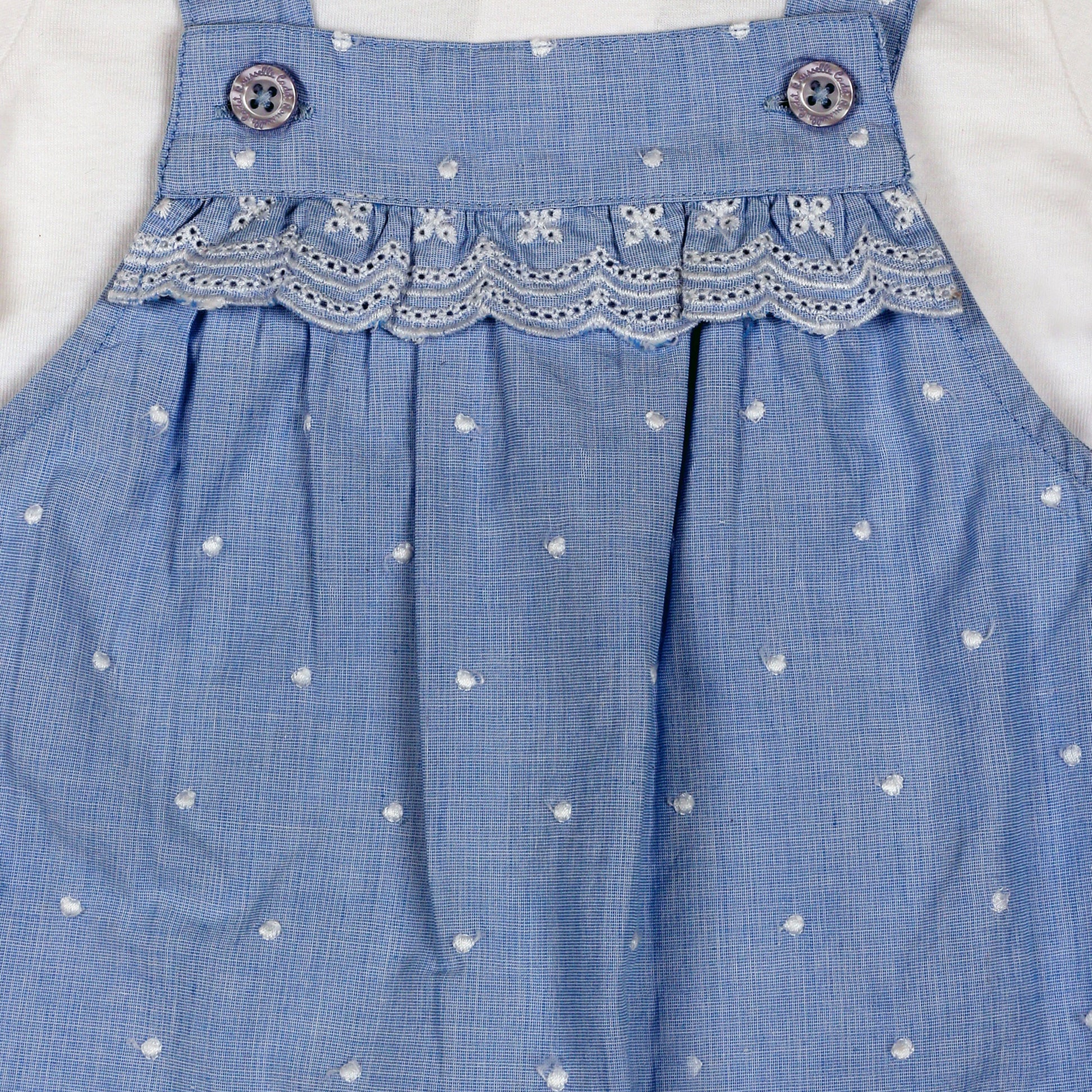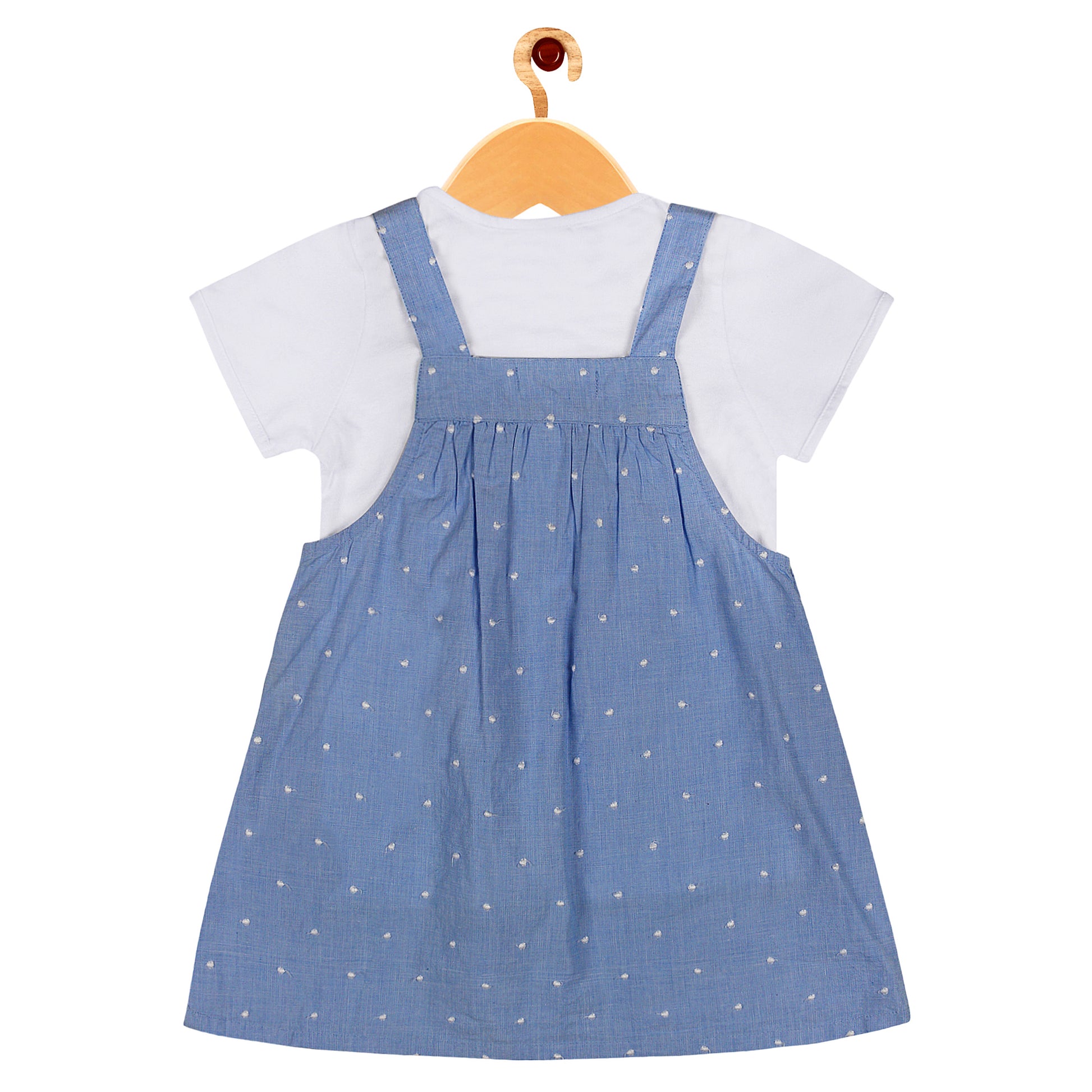 Featuring a beautifully embroidered pattern on the dungaree, this girls' dungaree and T-shirt set is sure to catch the eye. The delicate embroidery can add a touch of elegance, making your child stand out at any gathering. And, the T-shirt, on the other hand, sports a classic solid pattern that complements the detailed dungaree, offering a balanced, stylish look. Hence, this combination makes it easy to dress your little one for any occasion.