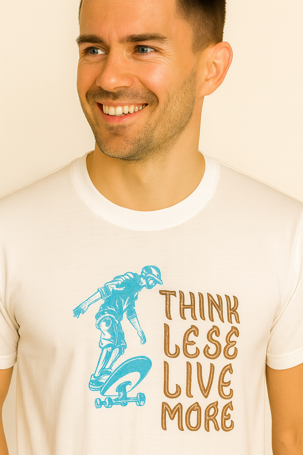 The T-shirt is highlighted with a vibrant skater graphic print in blue, alongside the motivational text “Think Less, Live More” in bold typography. With its round neck, short sleeves, and regular fit, it’s the ideal pick for daily wear, outings, or college style. Stay stylish and comfortable with this white cotton hosiery graphic T-shirt, perfect for men who love to keep it casual yet trendy. Made from premium hosiery cotton fabric, it offers a smooth, stretchable feel with excellent breathability for everyday comfort.